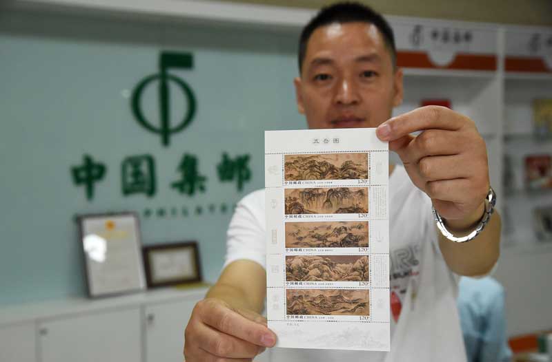2019年8月3日,河北邯郸,中国邮政集团公司工作人员展示《五岳图》特种邮票小全张。