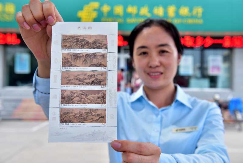 2019年8月3日,石家庄,中国邮政集团公司新乐市分公司工作人员展示发行的《五岳图》特种邮票小全张。