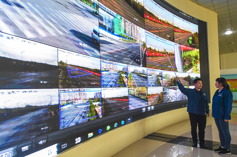 11月13日,河北通用微波塔有限公司工作人员在查看智慧灯杆监控系统的运行情况。