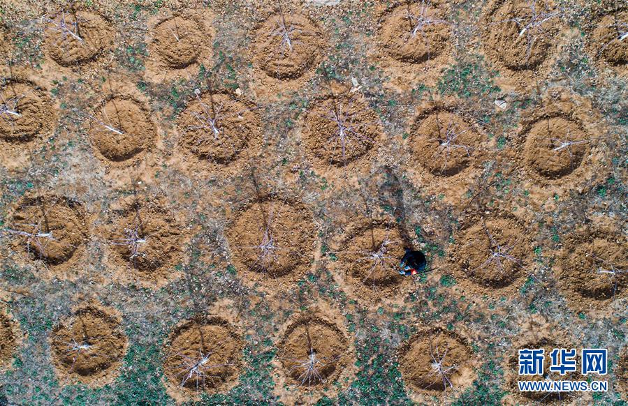 3月4日,武安市马家庄乡北果村的村民在修剪果树(无人机照片)。新华社记者 王晓 摄