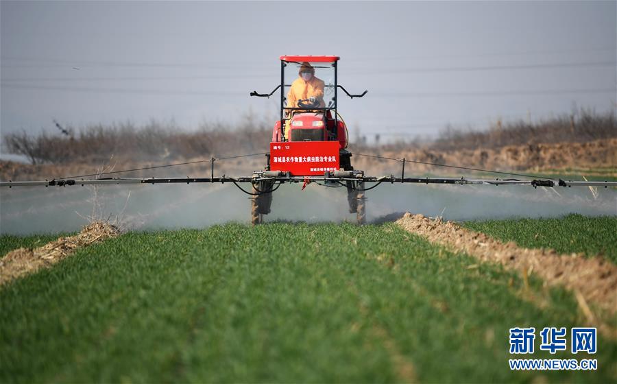 近日,为确保疫情期间不误农时,陕西省蒲城县植保植检站组织县内7家农作物病虫害专业化防治单位,在小麦返青起身期,对麦田进行除草及病虫害的防控工作。 新华社记者 李一博 摄