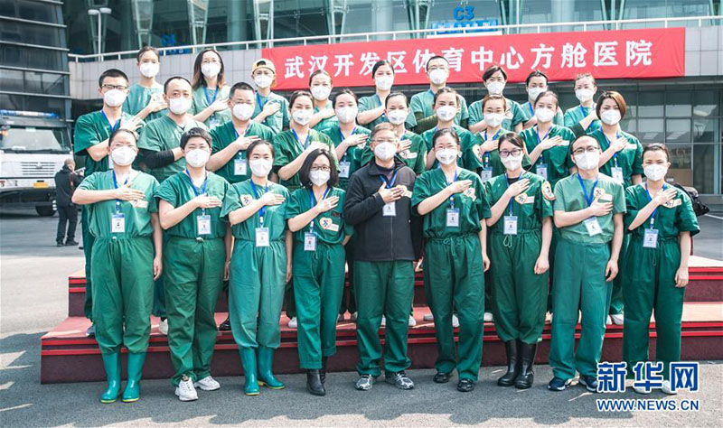 当日,随着最后一批患者康复出院,武汉体育中心方舱医院正式休舱。休舱后,医务人员在舱前合影留念。 新华社记者 肖艺九 摄