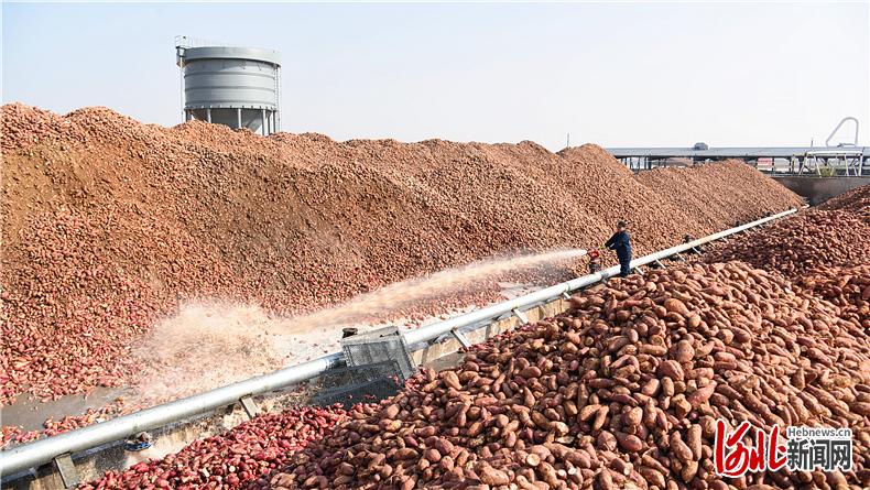 日前,位于卢龙县的河北中薯农业科技集团股份有限公司厂区外收购点,甘薯堆积如山,一车车甘薯正源源不断运往这里;厂房内甘薯加工设备高速运转,工人有序紧张工作。