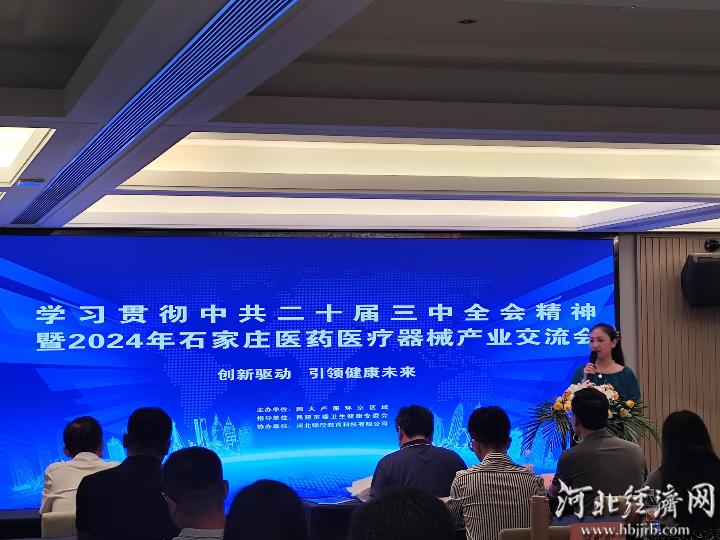 河北经济日报讯(孙兴兴 宋华裕)8月24日,由民建石家庄市委卫生健康委组织召开的“创新驱动 引领健康未来”学习贯彻中共二十届三中全会精神暨2024石家庄医药医疗器械产业交流会在石家庄汇宝国际康养中心举办。民建河北省委参政议政部部长陈志刚、民建石家庄市委卫生健康委主任董世忠、因大产服环京区域总经理霍海涛等领导出席了本次活动。会议由民建石家庄市卫生健康委委员、河北省医药行业协会副会长陶丽敏主持。