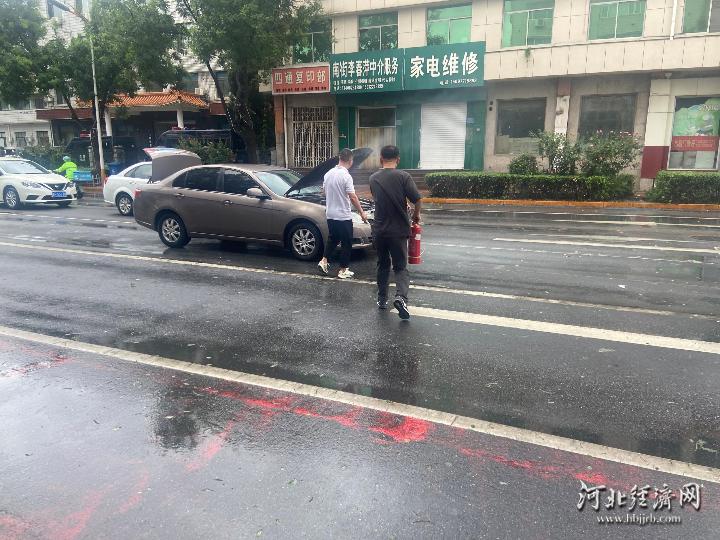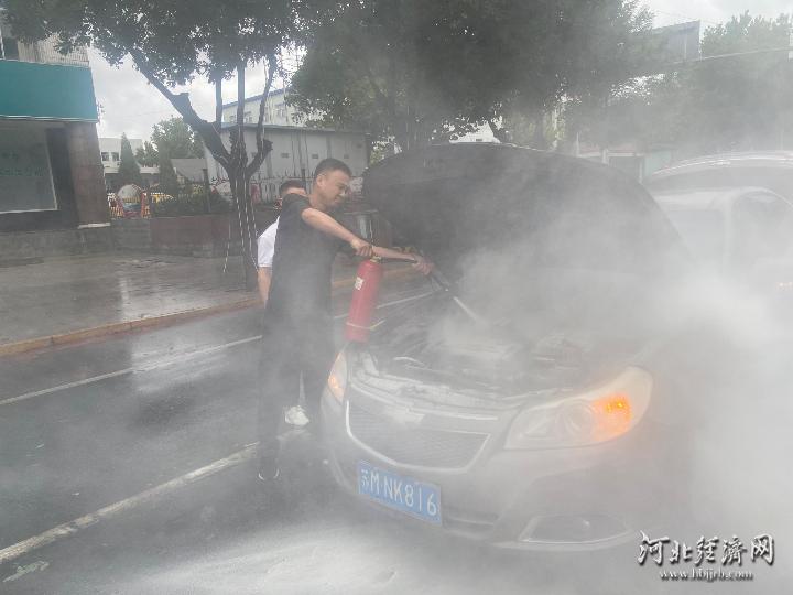 河北经济日报讯(通讯员 吴冠杰 庞龙光)8月26日10时19分,河北保定顺平县城区内,一辆轿车行驶至平安东大街与顺兴路交叉口时,前机盖突然冒出浓烟。停车后,司机下车打开前机盖,发现有阵阵火苗向外乱窜。只见司机慌乱地从后备箱拿出车载小型灭火器扑火,但由于火势过大,车载小型灭火器并不能立即压制住乱窜的火苗。