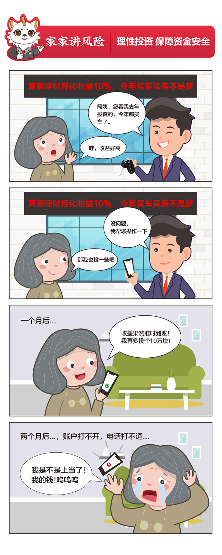 一、天上不会掉馅饼,投资理财需谨慎,不轻信所谓“真保本、高回报”的虚假承诺。
