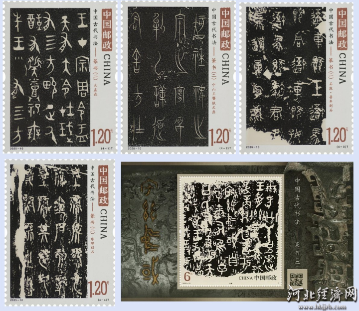 《中国古代书法——篆书(二)》特种邮票1套4枚,小型张1枚。邮票图案名称为:大盂鼎、中山王cuo铁足鼎、石鼓·吾车刻石、琅琊刻石,小型张图案名称为:何尊。全套邮票面值4.80元,小型张面值6元。本套邮票精选五件文物,通过其青铜铭文与石刻文字拓片,传递千年篆韵。其中第2枚邮票内容取自刻于战国中山王cuo墓出土的中山王cuo铁足鼎上的古文字——中山篆,这不仅是对中国古代书法艺术的传承,更展现了河北深厚的历史文化底蕴。