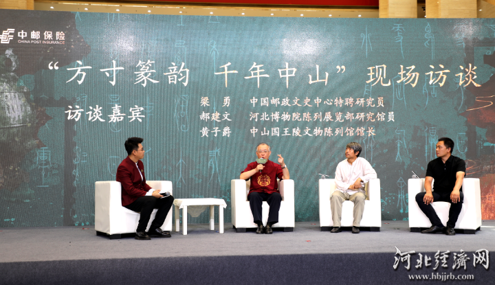 “中山篆”登上国家名片,美丽河北再添一景,不仅为方寸艺术注入深厚的燕赵文化基因,而且对展示河北形象、讲好河北故事具有重要意义。在当天活动的名家访谈环节,河北省文史馆馆员、中国邮政文史中心特聘研究员梁勇,河北博物院陈列展览部研究馆员郝建文,中山国王陵文物陈列馆馆长黄子爵共同交流探讨了中山篆背后的文明密码、创新发展以及文化传承。