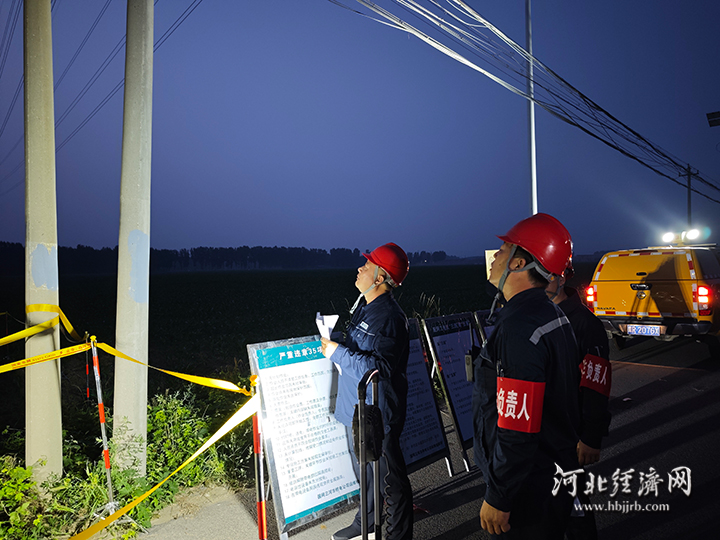 “今日放线、紧线工作时要注意10千伏221付辛庄一线尹辛庄水利支路6号-7号杆上方的110千伏输电翟皇线,挂好个人保安线,严防感应电伤害,务必做到‘零违章、零事故’!”凌晨4时,工作负责人侯华东正通过班前会交代作业范围、作业任务及风险点,安全员补充强调“防触电、防高坠、防误操作”三大核心防控措施。全体成员逐一确认分工,并在工作票上签字,确保责任到人。
