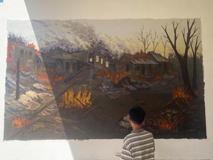 4幅壁画造型兼顾真实感与艺术感,通过视觉艺术串联起潘家戴庄的“过去-创伤-纪念-重生”,第一幅展现惨案前百姓宁静的田园生活,第二幅刻画惨案发生时大火吞噬家园的惨烈景象,第三幅描绘新时代潘家戴庄的新农村风貌,第四幅以学生群体作为新一代的象征,传递爱国精神内核。“对比战前与战后场景,心像被揪着。曾经的静好被撕碎,太痛心。现在能做的,就是用画笔守住历史,不让它被遗忘。”参与绘制的学生郝跃然动情地说。