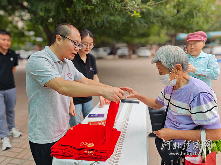 志愿者为社区老人发放纪念品。张朝阳 供图