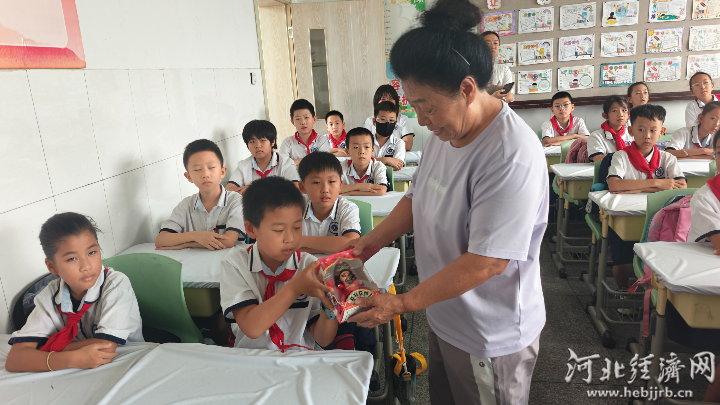 科普志愿者给学生发放科普纪念品。 马建明 摄