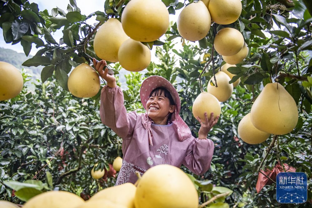 ↑ 10月15日,云南省文山壮族苗族自治州西畴县鸡街乡村民采摘柚子。新华社发(熊平祥 摄)