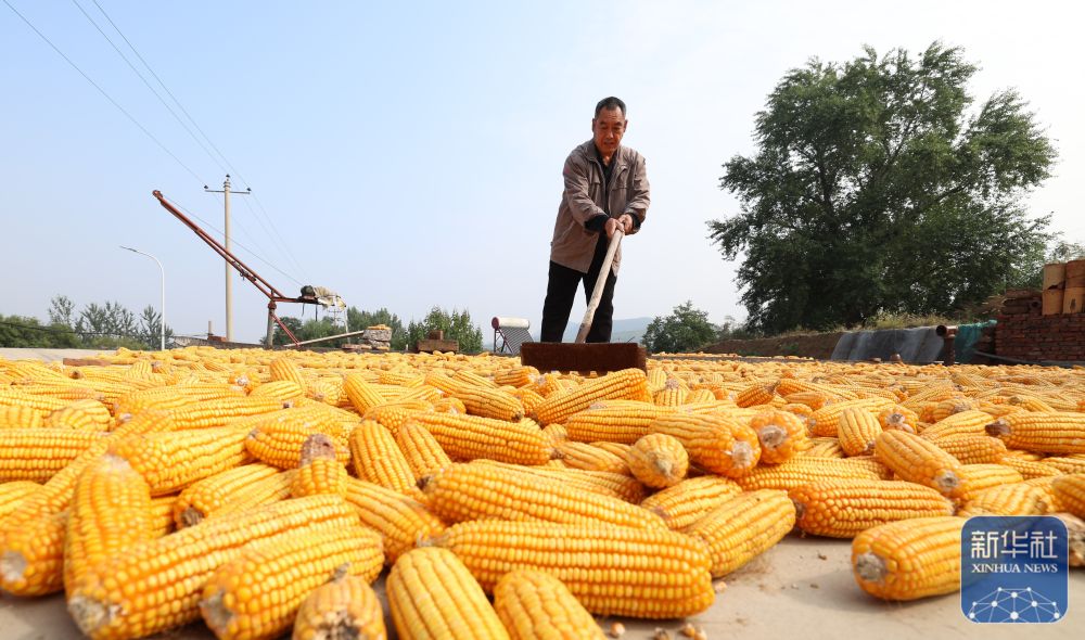 ↑ 10月15日,河北省石家庄市井陉县秀林镇南横口村村民在场院晾晒玉米。新华社发(梁子栋 摄)
