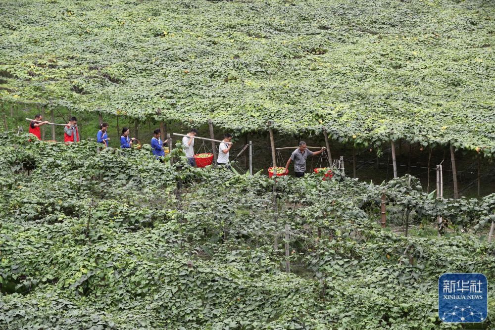 ↑ 10月14日,村民在贵州省黔东南苗族侗族自治州榕江县忠诚镇俾堵村罗汉果种植基地挑运罗汉果。新华社发(李长华 摄)