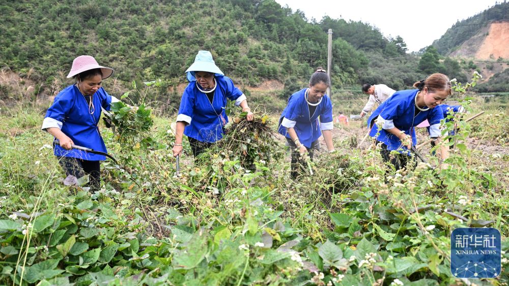 ↑ 10月15日,广西三江侗族自治县林溪镇高秀村村民在田间收获红薯。新华社记者 张爱林 摄