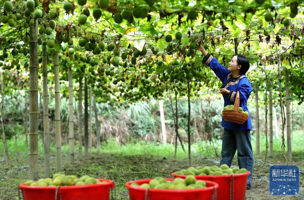 ↑ 10月14日,村民在贵州省黔东南苗族侗族自治州榕江县忠诚镇俾堵村罗汉果种植基地采摘罗汉果。新华社发(李长华 摄)