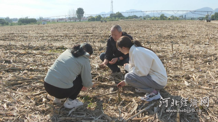在石家庄市鹿泉区小毕村的农田,农技专家蹲在田埂边,伸手扒开表层土壤,仔细查看土壤结块程度与湿润度。他们一边用手揉搓土壤颗粒,一边相互交流播种深度、播种密度等关键细节。专家剥开枯黄的苞叶,仔细查看雨后对未收获玉米的影响情况。针对冬小麦播种时间滞后的现状,农技专家对农户给出具体的播种时间建议,同时详细介绍适合当前土壤条件的播种方式,帮助农户避开播种误区。