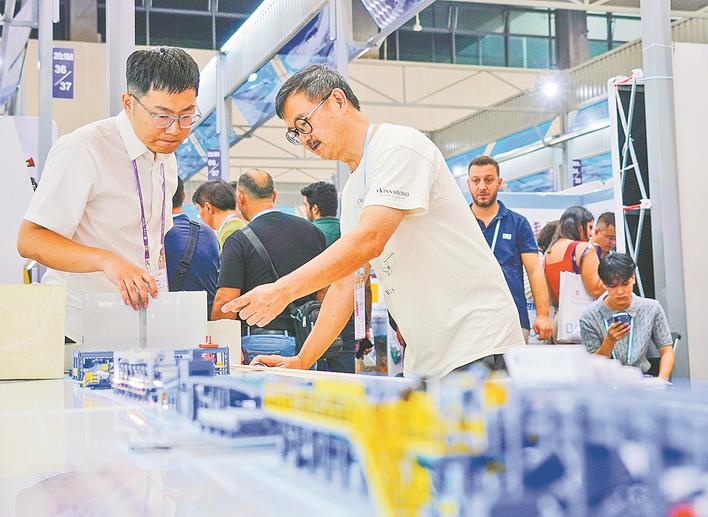 10月16日,客商在第138届广交会展馆浙江精工智能建材机械有限公司展台观看生产线模型。新华社发
