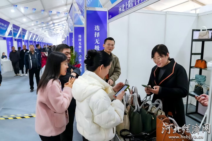 展览会现场,游客在购买皮包。无极县委宣传部 供图