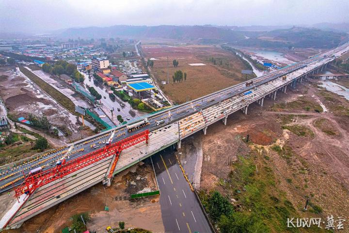 通过多次保通施工导改,10月11日,石太高速公路改扩建项目控制性工程甘陶河大桥最后一片梁体精准落位,标志着项目全线梁板架设完成。长城网·冀云客户端记者 李皓 摄