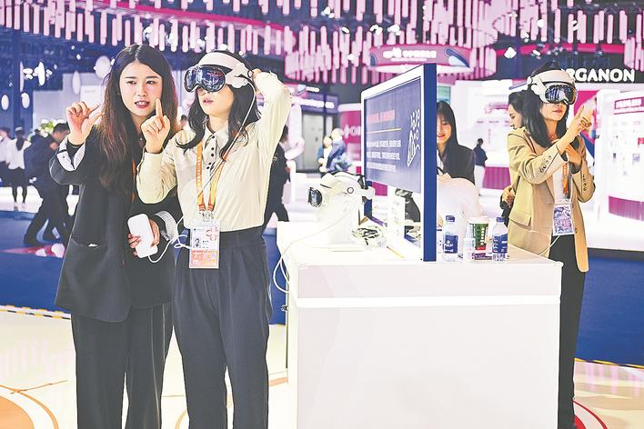 11月7日,观众在第八届中国国际进口博览会医疗器械及医药保健展区诺华展台通过智能眼镜了解肾脏知识。新华社记者 陈浩明 摄