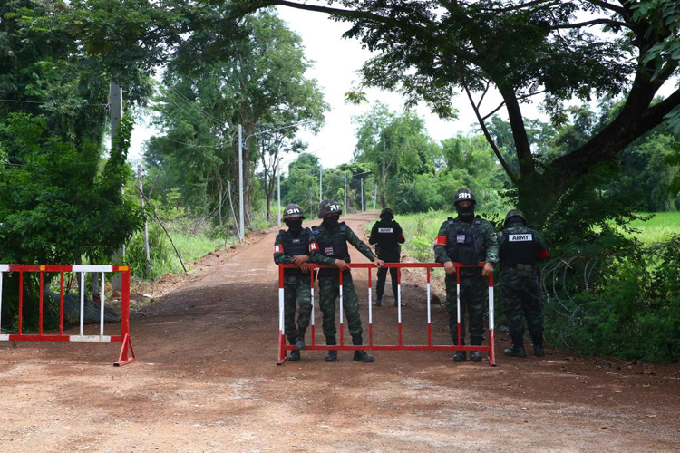 10月9日,士兵在泰国沙缴府紧邻泰柬边境的班农禅村警戒。新华社记者孙玮彤摄