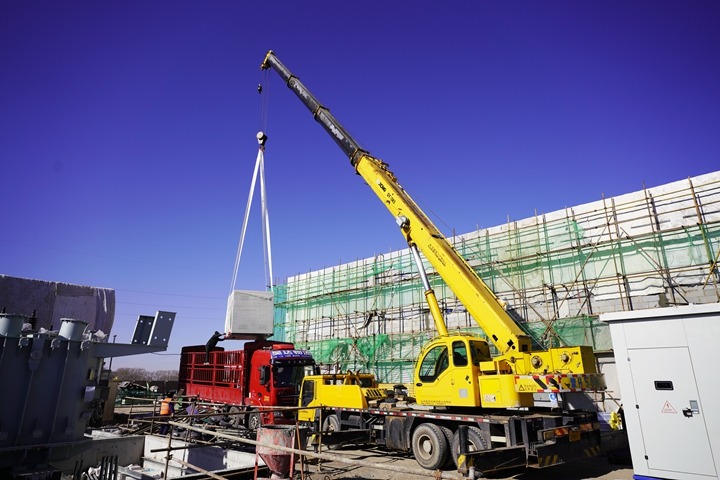 在升压站施工现场,吊车挥舞着巨臂,不断为施工人员运输物料,作业人员配合默契。面对现场交叉作业多、作业面狭窄等困难,项目团队严格把控设备开箱验收、吊装就位等关键环节,确保设备“毫发无损”地落座于预定基础之上。