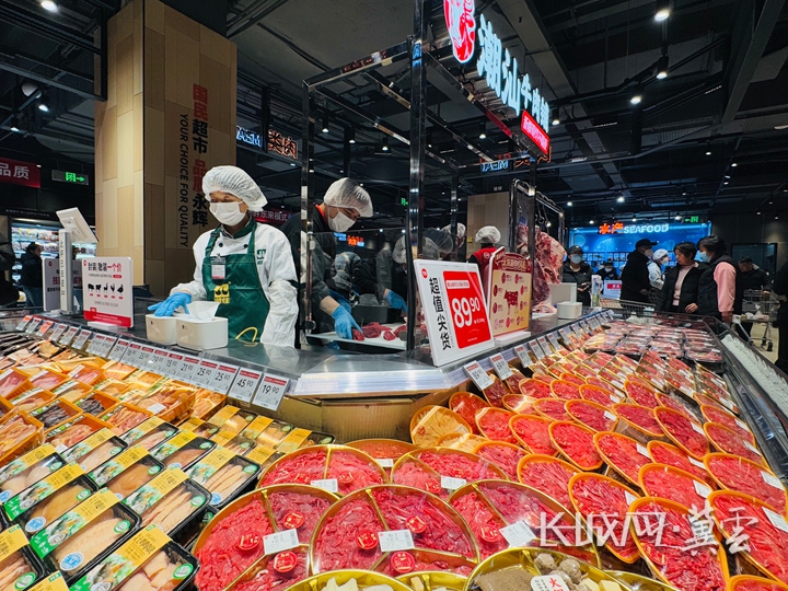 在细节服务上,货架旁配置放大镜便于老年顾客阅读信息,连卷袋区配备湿手器,冷链区与榴莲柜台分别提供防冻手套与防刺手套。加工服务实现全覆盖:肉禽柜台支持切丝、切片、绞肉等免费加工,并提供牛排免费代煎;海鲜区鲜活鲈鱼、帝王蟹等均提供清洗、打氧、打包及免费代蒸服务;购买整个西瓜、榴莲等水果可享受免费现切。