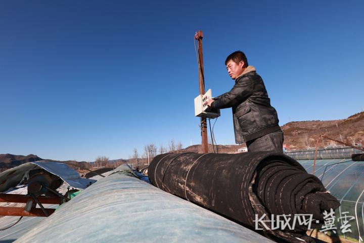 许宝茹在大棚顶上驱动电机。长城网·冀云客户端记者 袁立朋 摄