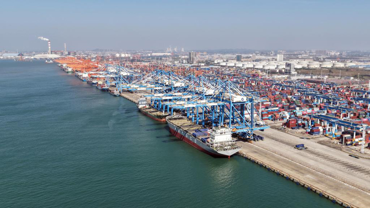 图为繁忙的广西北部湾港钦州港区。(陈磊 摄)