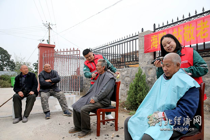 “太行电工”志愿服务队员为山区老人义务理发。康伟 摄