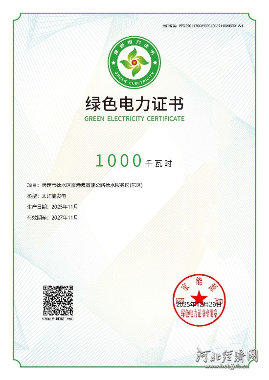 河北经济日报讯(通讯员 魏申琦 王磊)12月30日,河北省冀交能源有限公司顺利完成河北省首批高速公路分布式光伏项目绿色电力证书交易工作。此项工作的圆满完成,标志着该公司在推进交通与能源融合发展、加快绿色转型方面取得重要突破,为推动绿色能源价值市场化、促进能源结构清洁低碳转型提供了有力支撑,同时为河北交通投资集团有限公司实现高速公路建设绿色零碳目标注入了新动能。