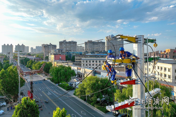 国网行唐县供电公司工作人员对10千伏914东新线及931朝阳线进行同塔架设。董少波 摄
