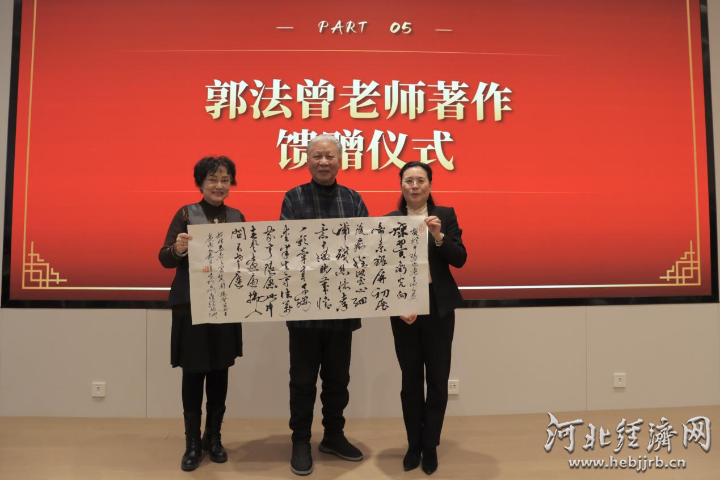 活动尾声,郭法曾向冀园居民代表赠送了亲笔签名的著作一《诗书图文选》,并向冀园赠送了抒发观影有感的七言律诗书法作品。
