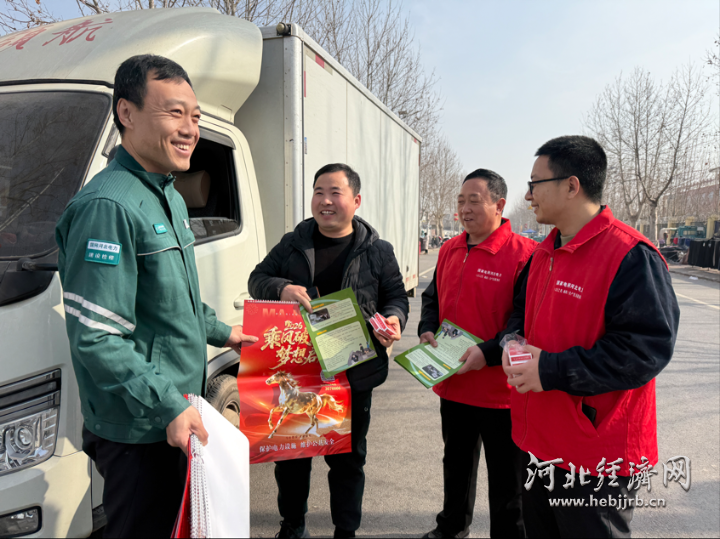 工作人员为返乡货车司机送上安全用电宣传手册。齐晓峰 供图