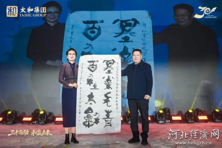 太和集团重要战略合作伙伴——金谈固投资集团党委书记、董事长郧继良,向太和集团总裁李美璇赠送精心创作的字画,以此表达对太和集团30周年的诚挚祝贺。