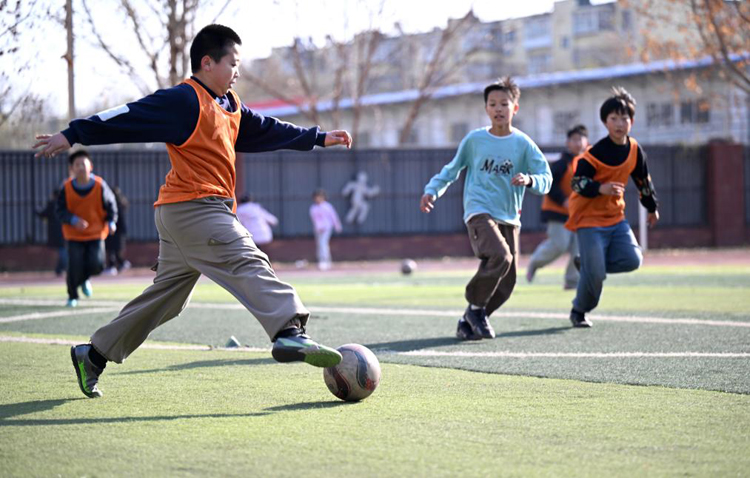 2025年12月9日,在河北省石家庄市柏林庄学校,学生们在课间进行足球比赛。新华社发(陈其保摄)