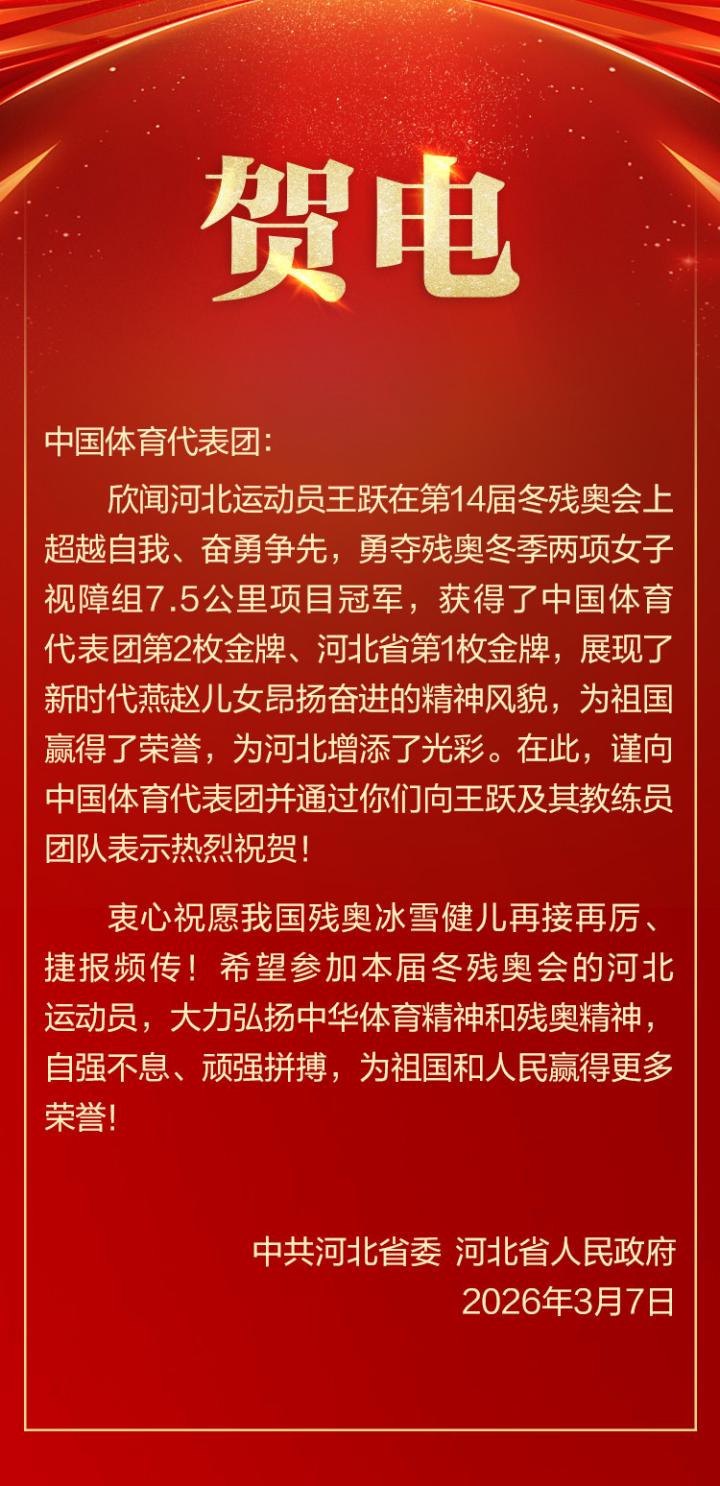 河北省委省政府向中国体育代表团致贺电