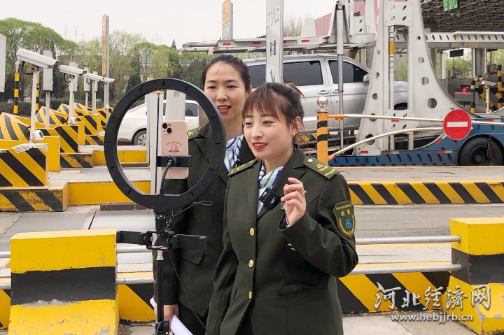 唐津高速工作人员在唐港收费站口直播路况信息。唐津公司 供图